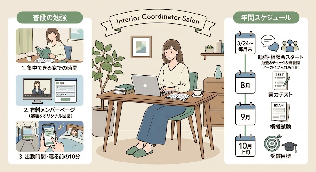 インテリアコーディネーターサロンでは、家などの集中できる環境では教本の読み込みや過去問での問題解き、隙間時間やちょっと疲れた日はスマホの一問一答アプリで「今日の10問」を解くなど、学習時間0の日を作らない勉強スタイルを提案しています!